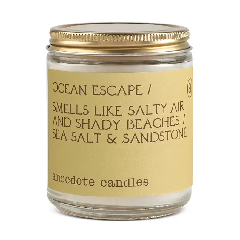 Ocean Escape Candle - Sea Salt & Sandstone. Top notes of marine water and sea salt float above a creamy base of sandstone and sandalwood. Hints of cyclamen flower, water lily, and vanilla orchid add a touch of sweetness.