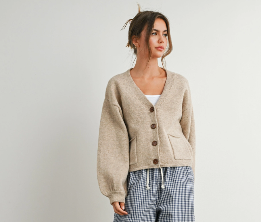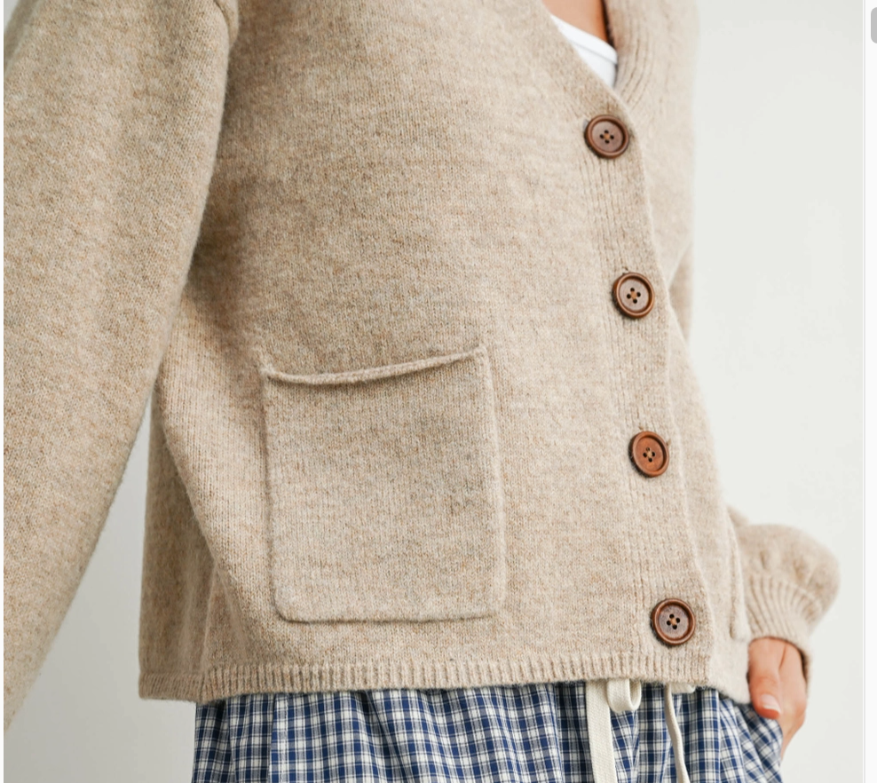 Buttermelon V Neck Cuffed Sleeve Cardigan Taupe