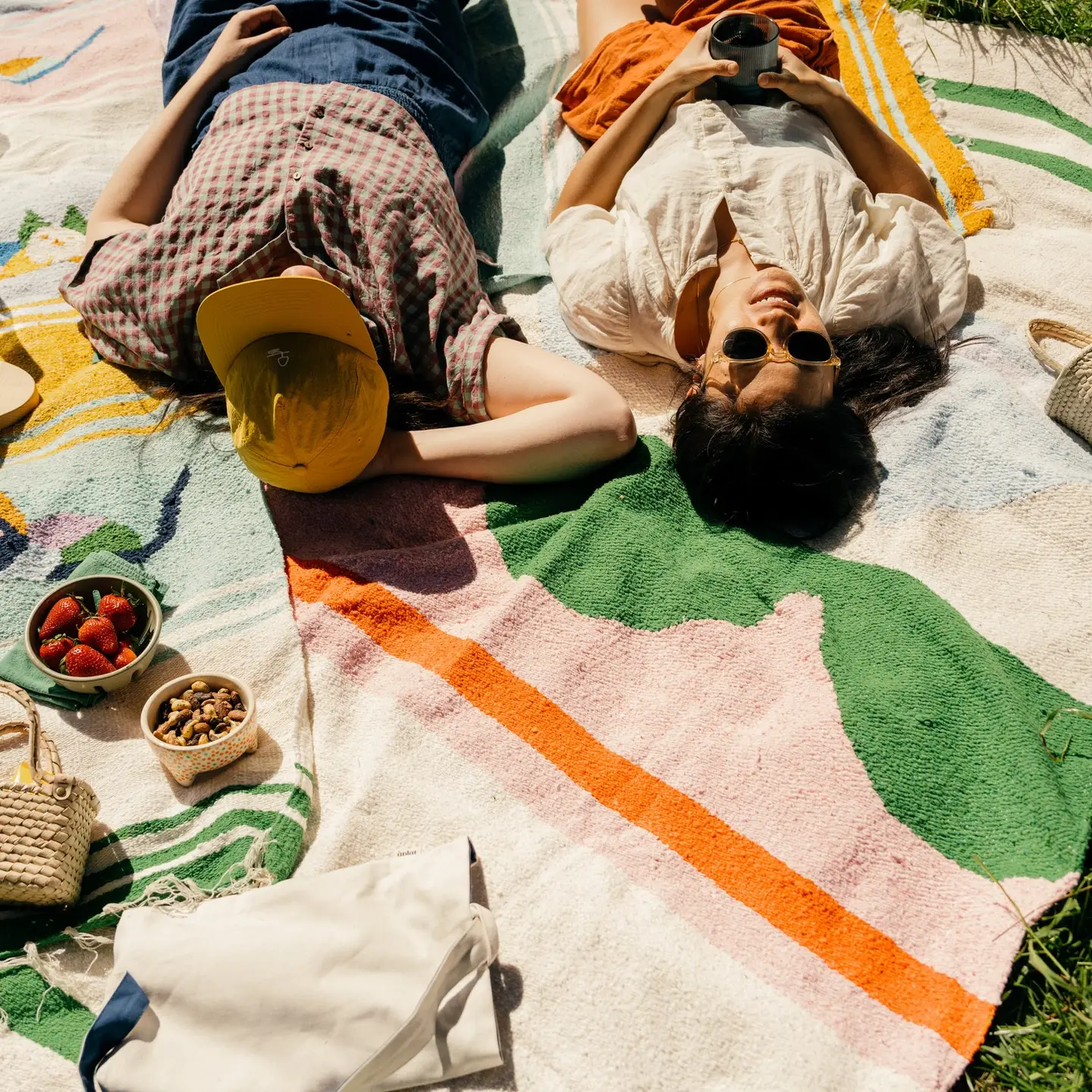 Our lively Vuelta blankets, adorned in grassy green, pink, and bright orange tones, evoke the spirited atmosphere of a sun-drenched park hang. Dar una vuelta, meaning to go on a walk, drive, or pedal, fit the joyful mood of these vibrant blankets.