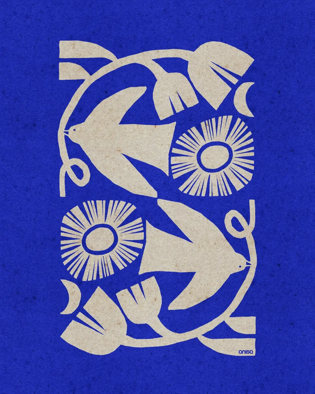Printed in crisp cream against a vibrant cobalt blue background with a natural paper texture, this piece brings warmth, symbolism, and quiet magic to any space.
