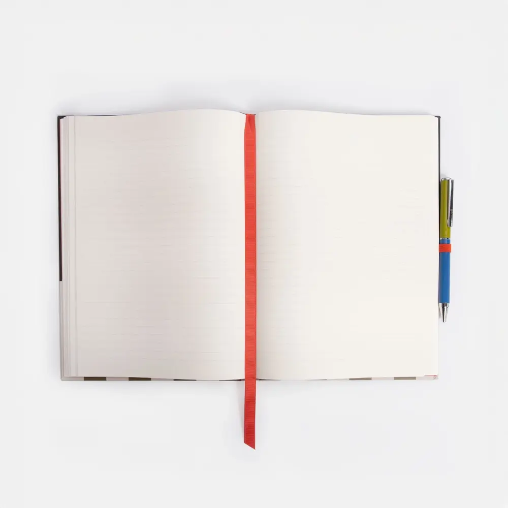 Block Stripe Notebook and Pen Set - Keep your notes safe in something stylish! This casebound notebook comes with 100 lined pages, contrast stripe inner page with pocket and ribbon page marker, and also a matching colour block refillable ballpoint pen.