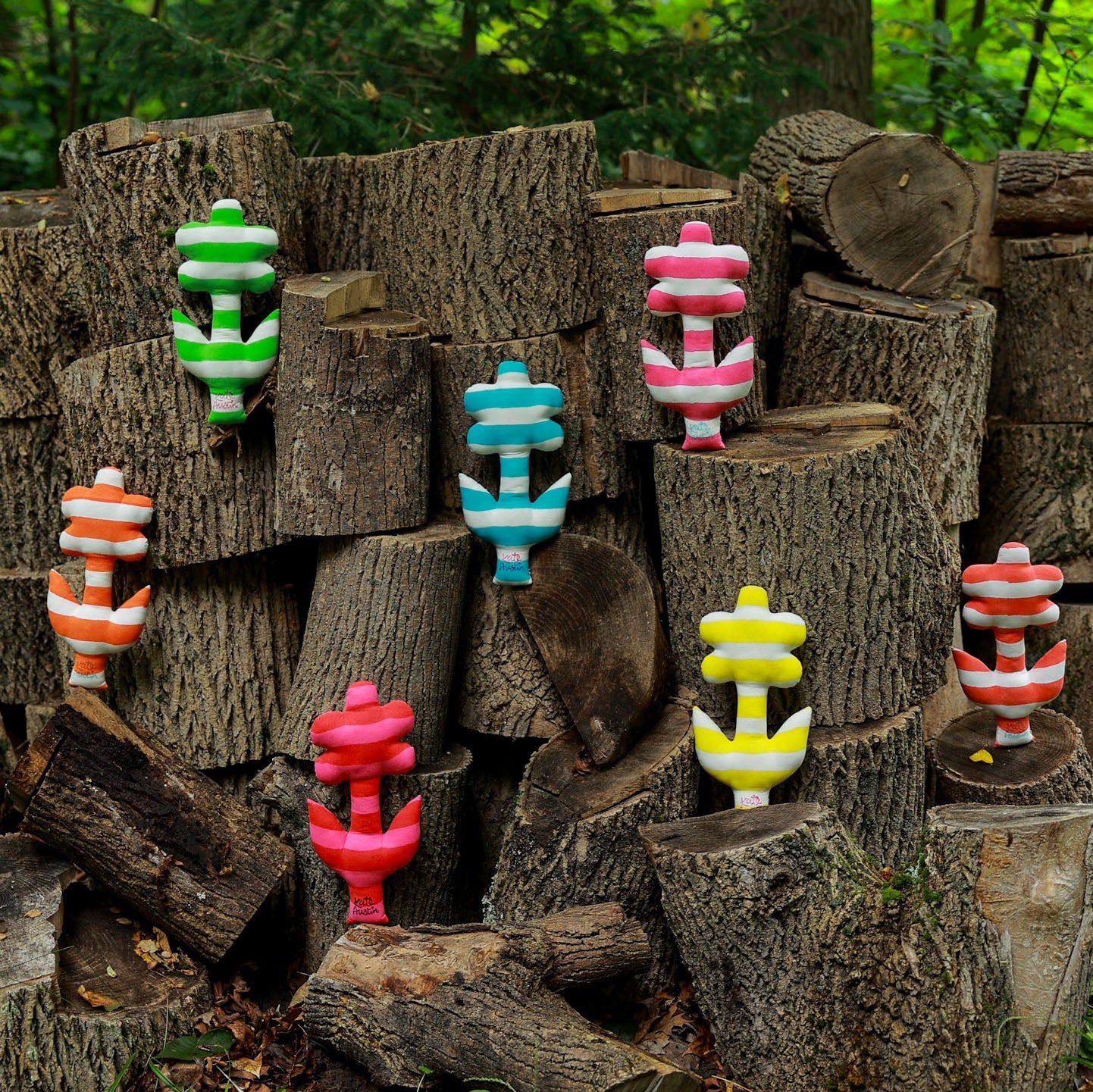 This cheerful flower pillow will add a touch of whimsy to your space. Sculpted in organic cotton, hand painted striped. Approx 12" tall. Mix and match with other shapes. Designed in Canada, made in a fair trade studio in India.