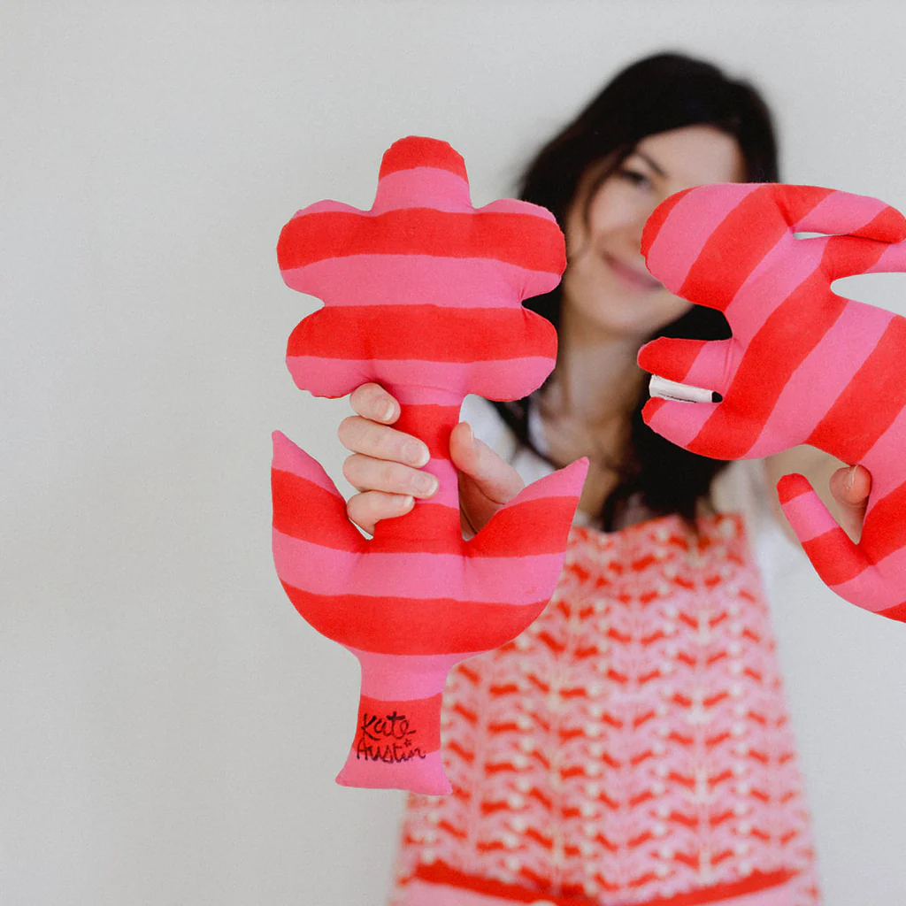 This cheerful flower pillow will add a touch of whimsy to your space. Sculpted in organic cotton, hand painted striped. Approx 12" tall. Mix and match with other shapes. Designed in Canada, made in a fair trade studio in India.