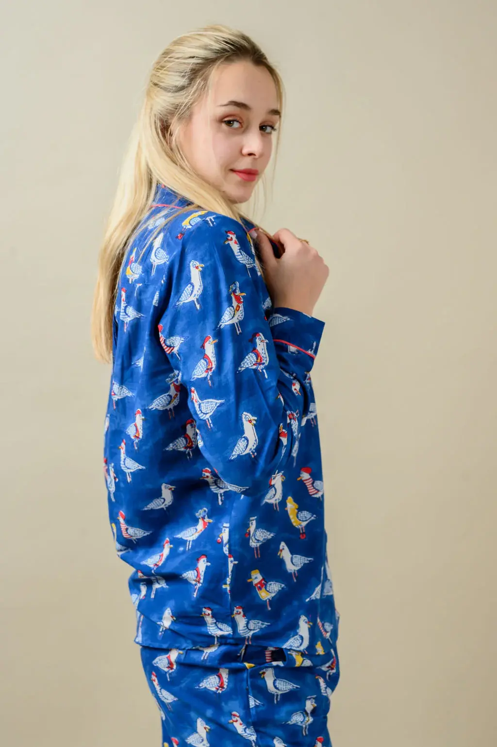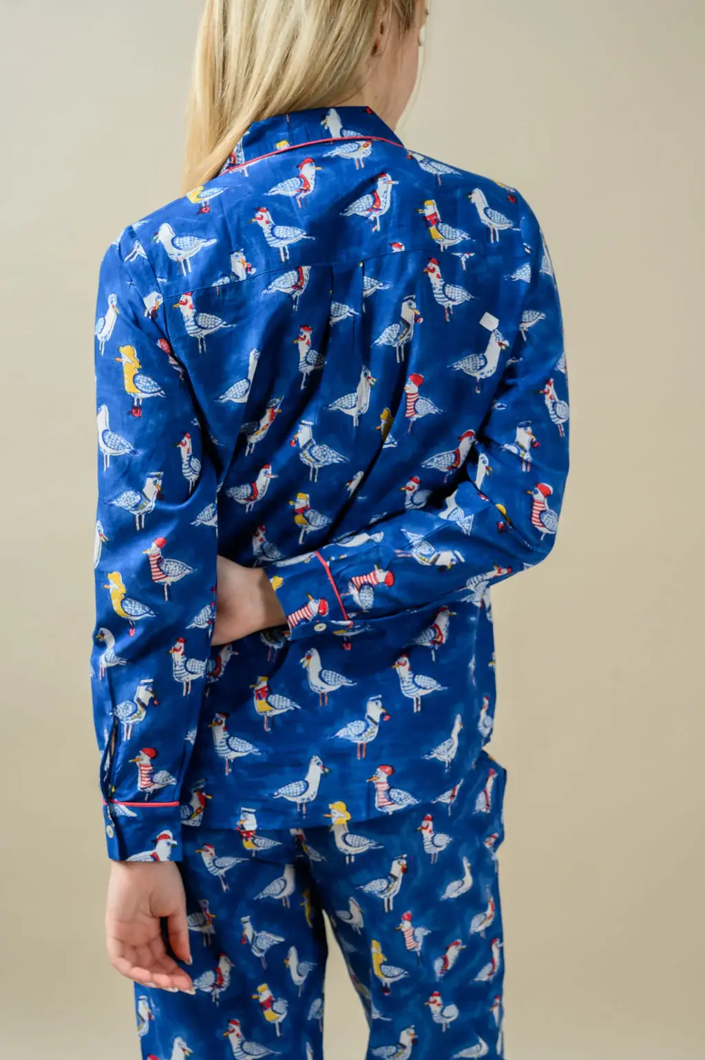 A quirky, cozy take on the classic pajama set. Soft, breathable cotton with Kores' signature hand drawn seagull print. Red piping detail for a polished look. Designed in Greece, block printed in India.