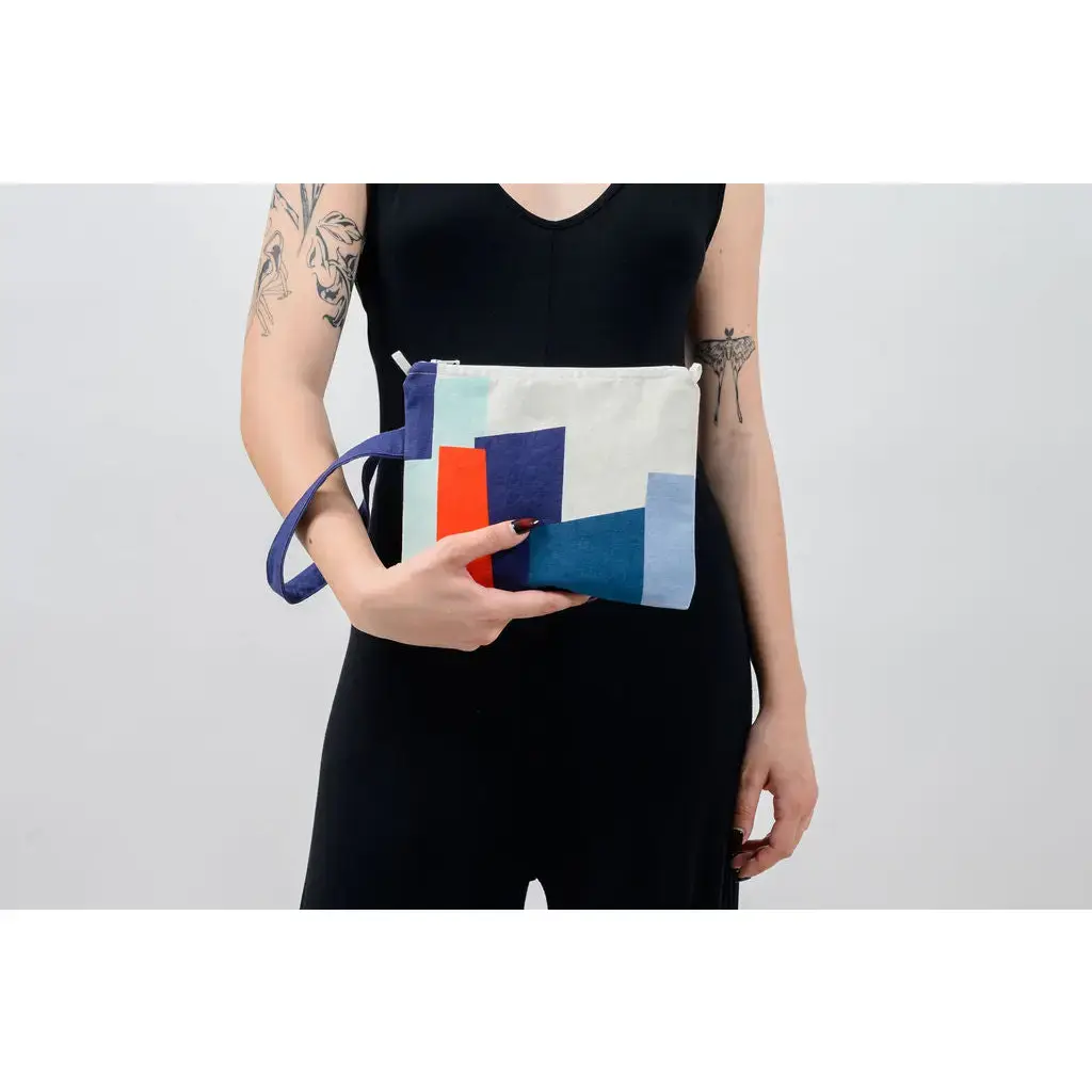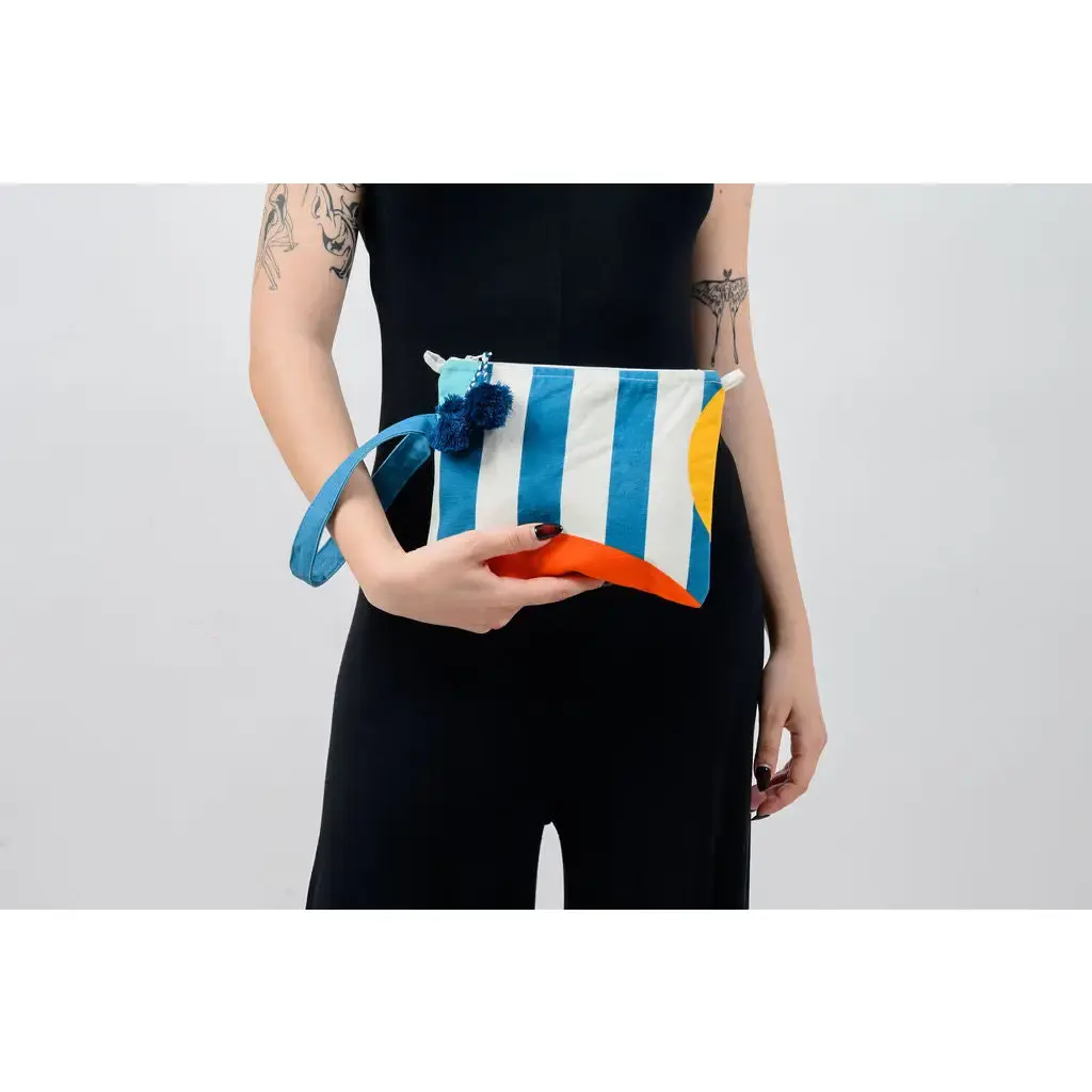 Striking, versatile carry all with wrist strap features graphic modern prints by Greece's Kores studio. Printed cotton with a water-resistant lining to protect contents. Zip close with hand-tied tassels. Dimensions 22x17cm. Perfect for life on the go!