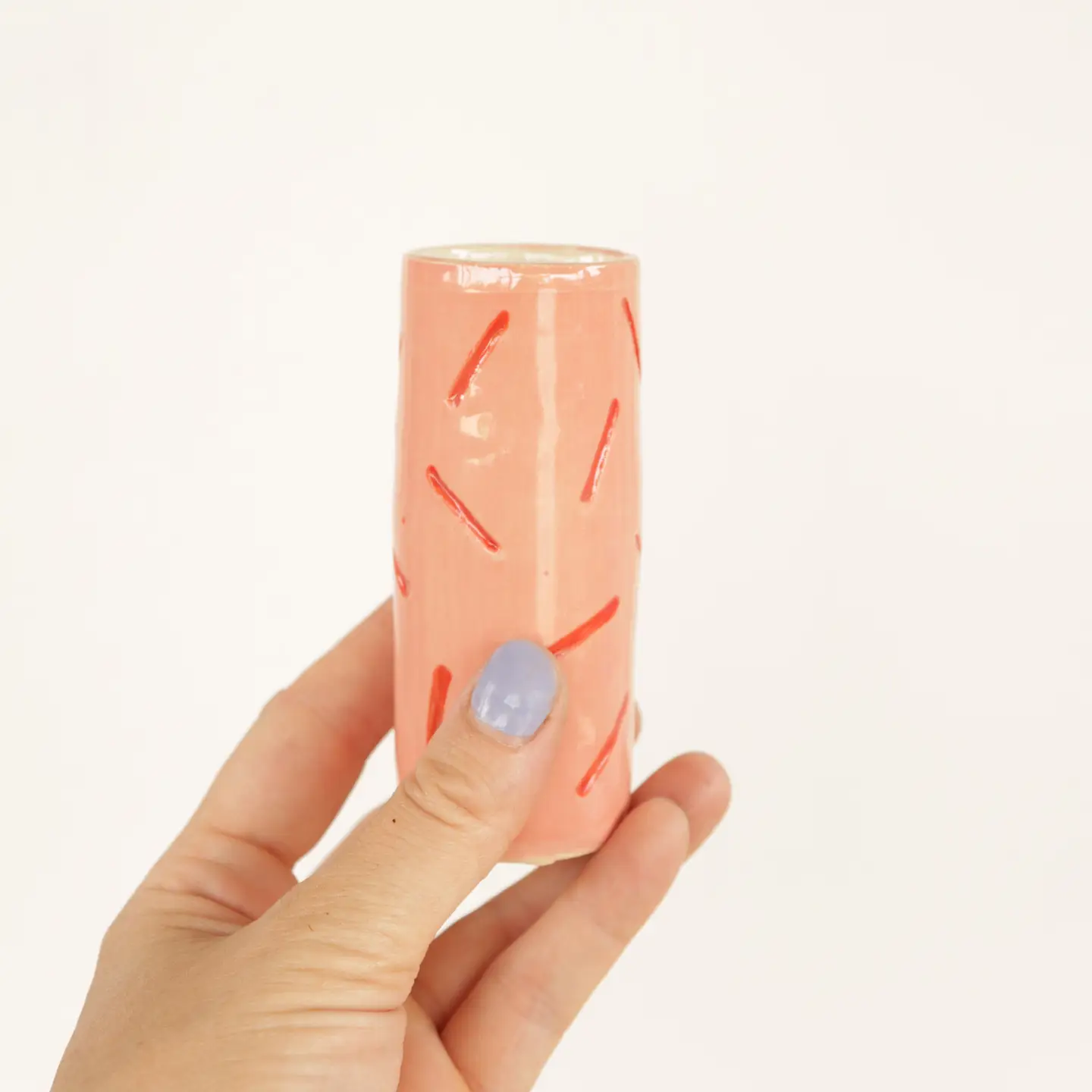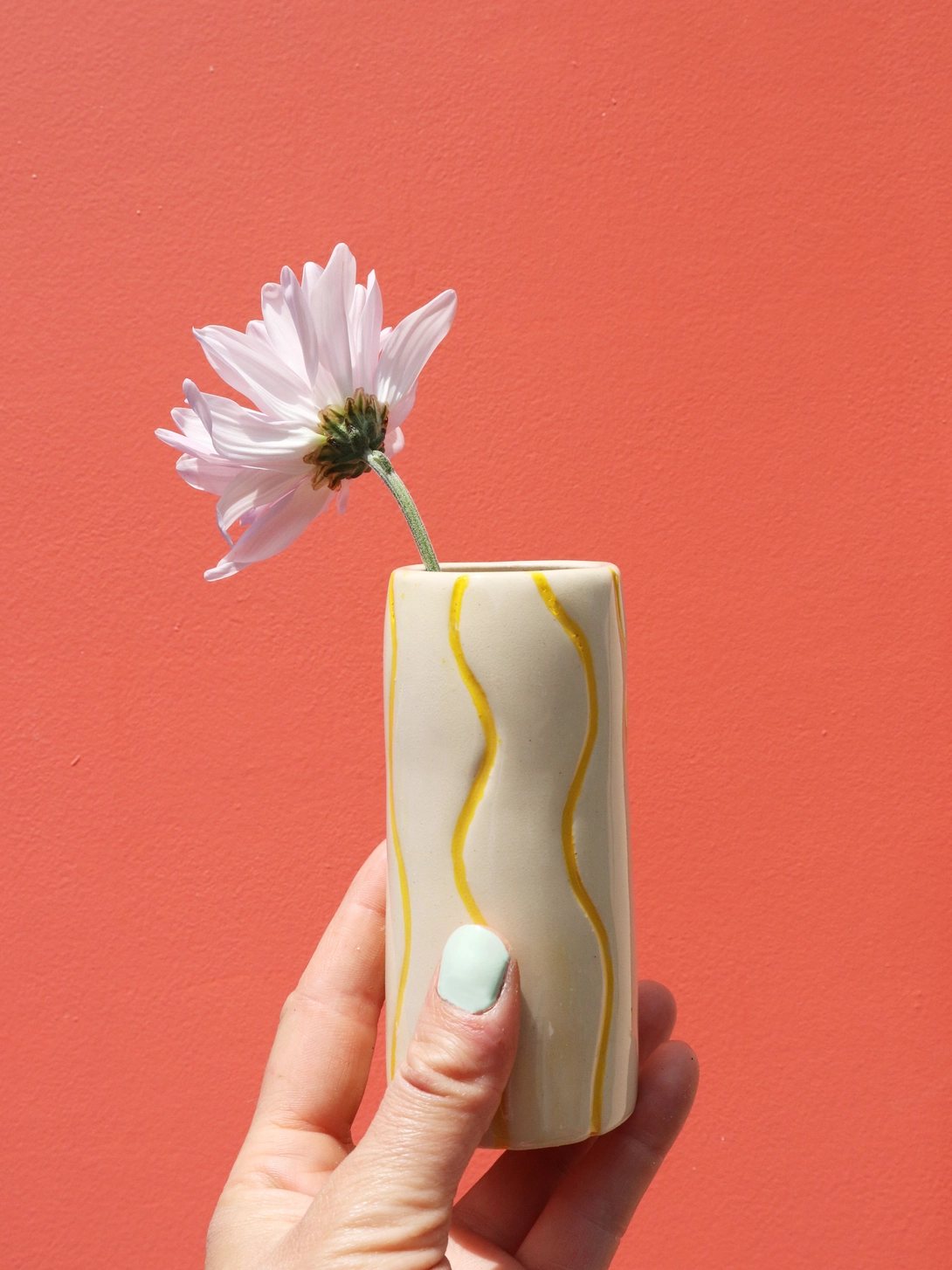 Cheerful bud vase with hand carved accents in vibrant yellow or pink. Handbuilt stoneware - 4" height, 2" diameter. Made in Canada.