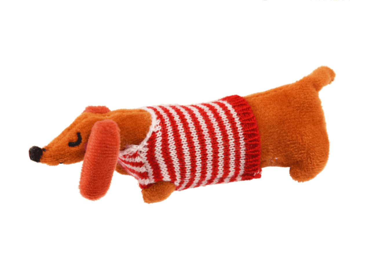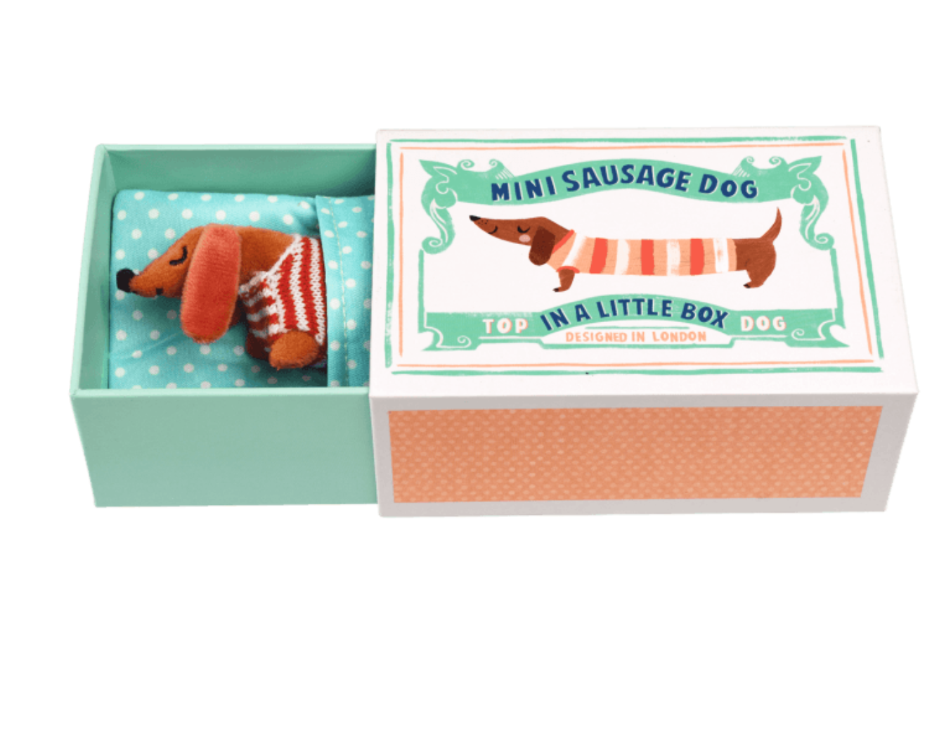 Mini Plush Sausage Dog in a Box - Little ones will love caring for this adorable sausage dog! This cuddly little Dachshund toy comes with his very own stripy jumper and polka dot blanket, all tucked up inside an illustrated gift box.