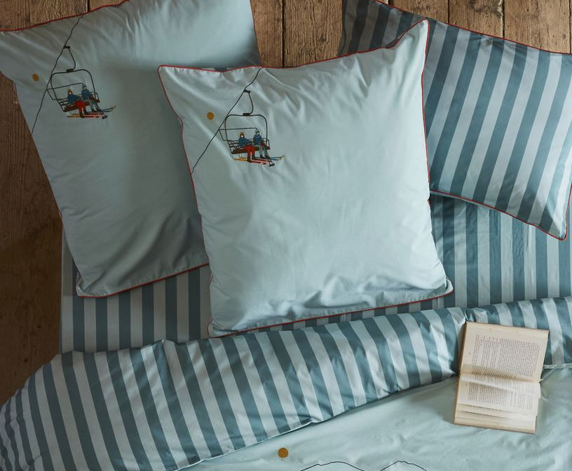 Generously sized bedroom or accent cushion in a crisp cotton percale. Finely detailed embroidery depicting alpine chair lift. Stripe pattern on reverse, contrasting accent edges. OEKO-TEX certified, designed in France. 65cm, insert is included.